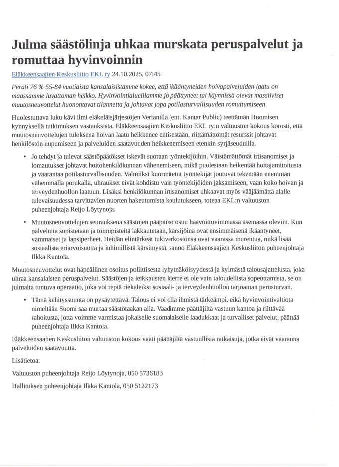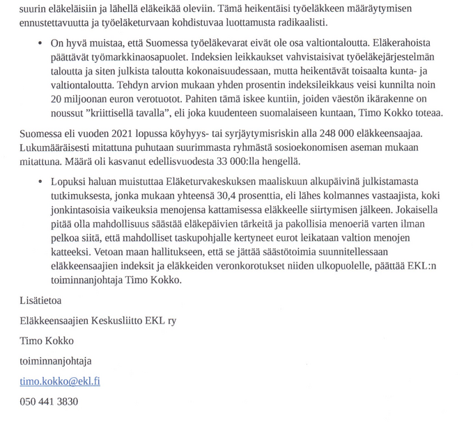 Kannanotto on sekä hämmentävä että huvittava. Pitänee onnitella Keskustanuoria siitä, että edunvalvonta tuotti tulosta ja kaksi sen kolmesta vaatimuksesta on toteutettu jo ennen niiden esittämistä, toinen jo yli kymmenen vuotta sitten, toteaa Eläkkeensaajien Keskusliitto EKL ry:n toiminnanjohtaja Timo Kokko.