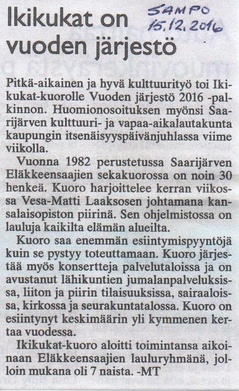 Saarijärven kulttuuri- ja vapaa-aikalautakunta myönsi Vuoden järjestö 2016 -palkinnon Ikikukat kuorolle.