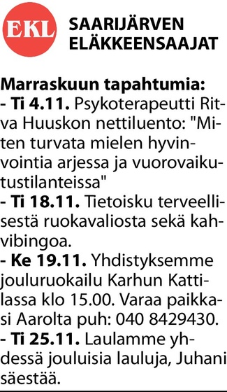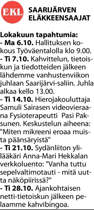 Eläkkeensaajien Keskusliitto EKL ry:n jäseneksi tullaan liittymällä johonkin liiton 350 paikallisyhdistyksestä, joita on eri puolilla Suomea. Ota yhteyttä kotipaikkakunnallasi toimivaan EKL:n yhdistykseen. Paikallisista yhdistysten lehti-ilmoitteluista (meillä Saarijärvellä Sampo) tai menemällä nettiin sivuille EKL. Paikalliseen Saarijärven yhdistyksen liittymisilmoitus aukeaa myös ylläolevasta punaisesta linkistä "liity" näpäyttämällä. Tavataan ja tullaan tutuisi!
