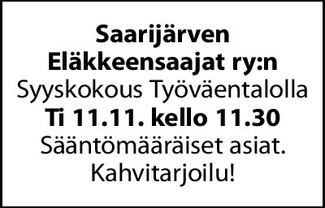 Ti 11.11. Yhdistyksemme syyskokous Työväentalolla alkaa kello 11.30. Käsitellään sääntömääraiset asiat. Kahvitarjoilu!