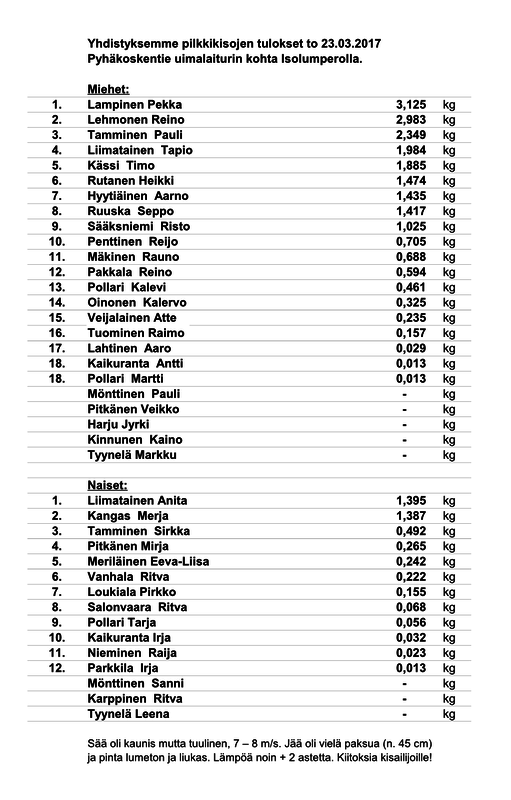 Yhdistyksemme pilkkikisat pidettiin torstaina 23.03.2017 kauniissa mutta tuulisessa säässä (7 - 8 m/s) Pyhäkoskentien varressa Isolumpero järvellä. Jää oli lumeton mutta liukas. "Ahti" oli toisille kitsas ja toisille antelias, vai mahtoiko taito ratkaista?Tulokset alla puhukoon puolestaan! |