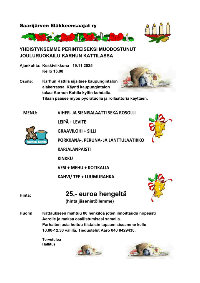 Yhdistyksemme perinteeksi muodostunut Jouluruokailu Karhun Kattilassa ke 19.11.2025 klo 15.00.