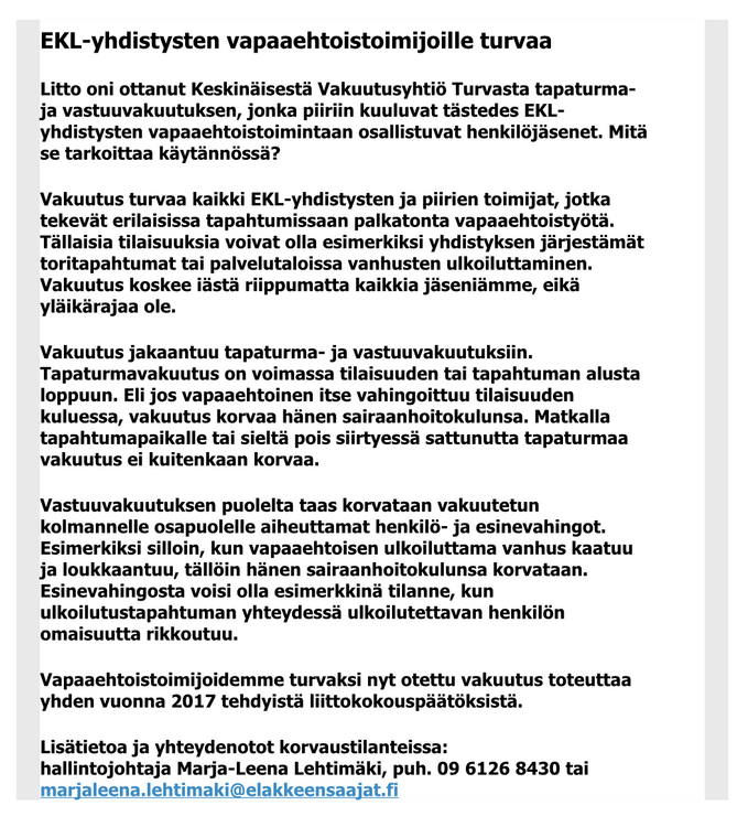 Vakuutusturvaa EKL-yhdistysten vapaaehtoistoimijoille